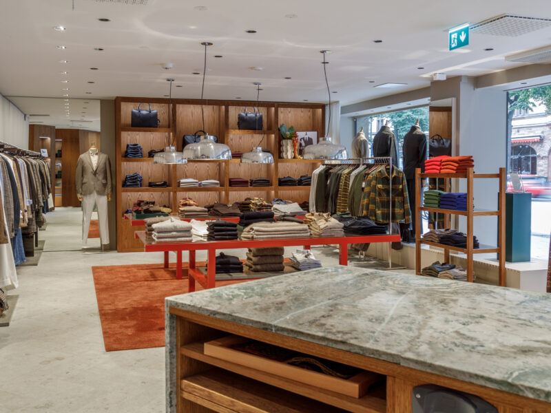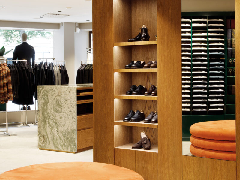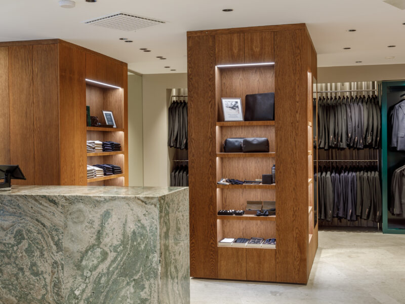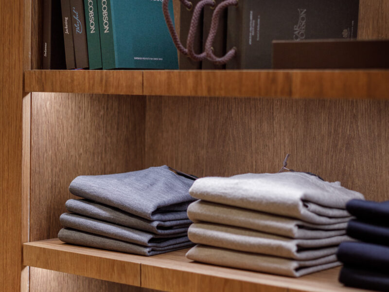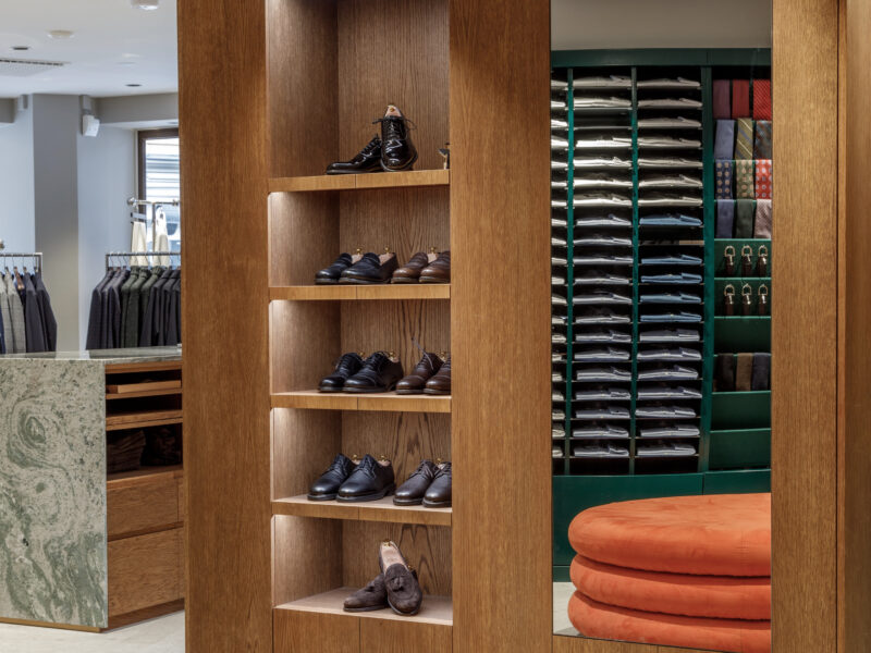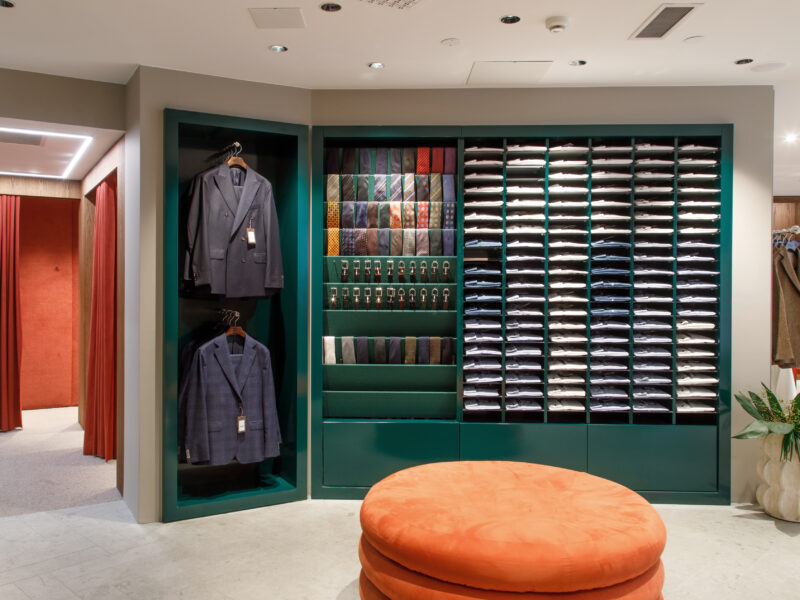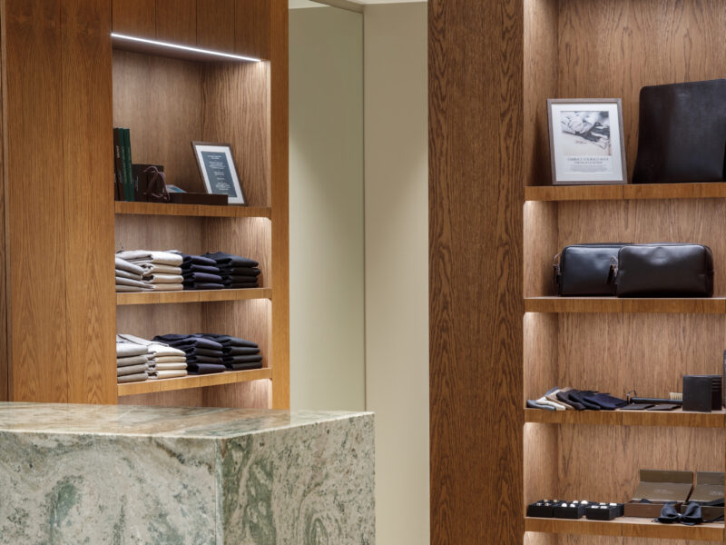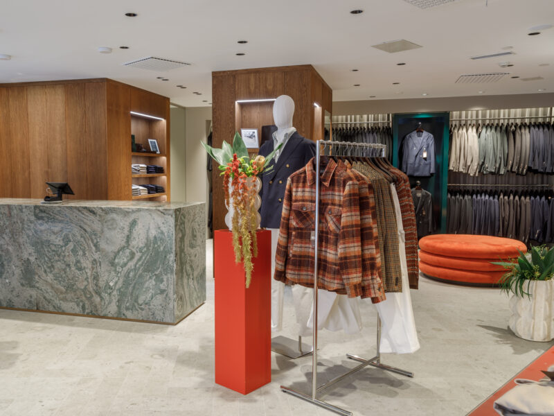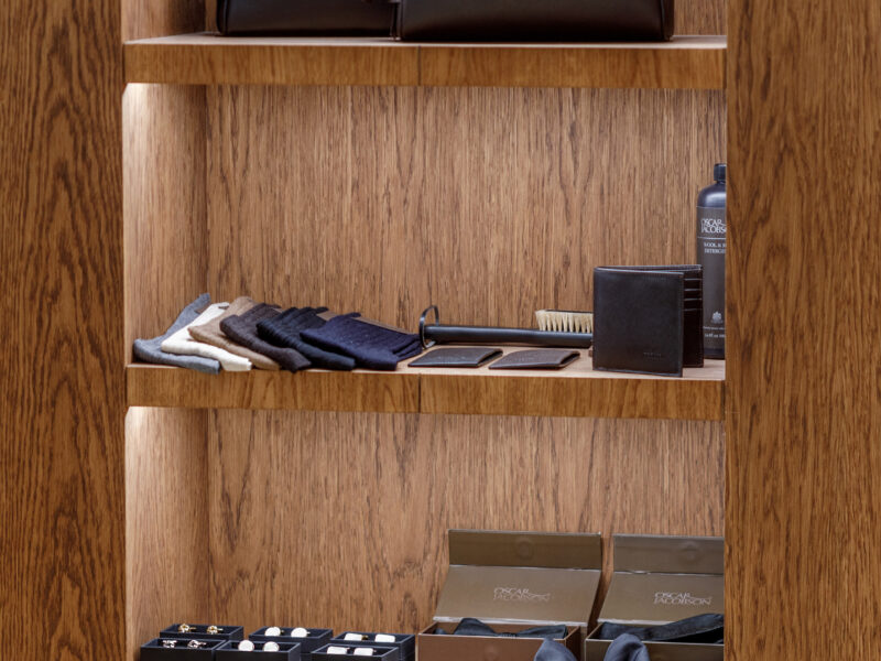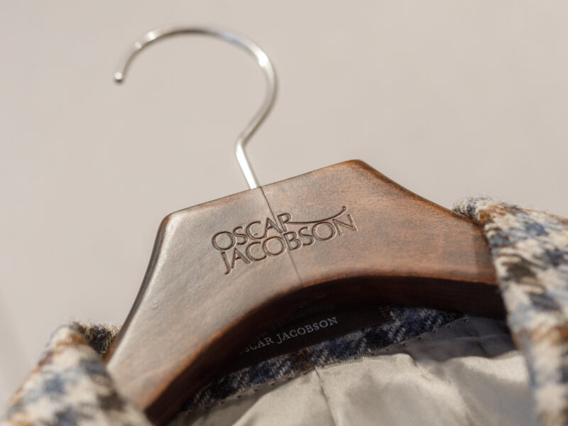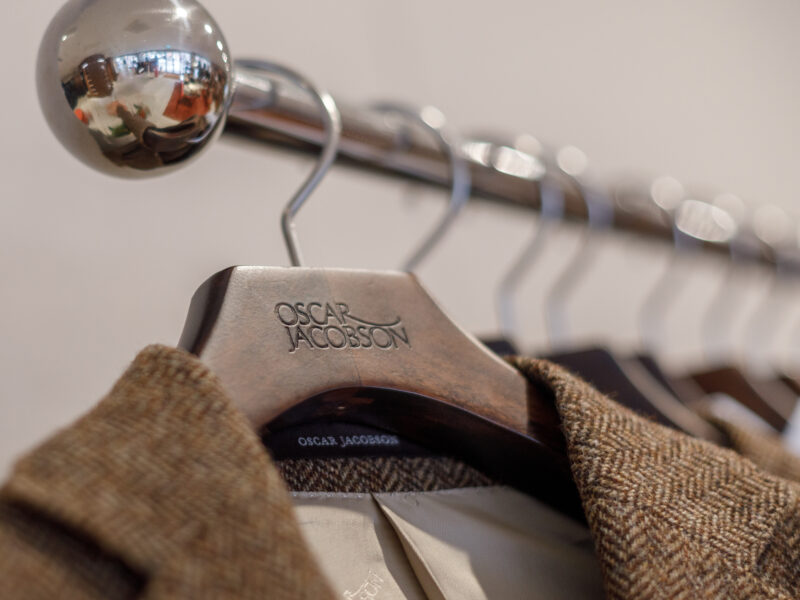 Aktualisierter Oscar Jacobson-Store in der Birger Jarlsgatan 6 in Stockholm. Oscar Jacobson ist ein schwedisches Herrenbekleidungsunternehmen, das 1903 vom Schneider Oscar Jacobson in Borås gegründet wurde. Oscar Jacobson war bis 1957 CEO des Unternehmens und wurde dann von seinem Sohn Anders Jacobson abgelöst. Oscar Jacobson arbeitet mit „Slow Fashion“. Das bedeutet, dass ihre Anzüge über zehn Jahre halten können. Dann muss die Qualität halten, der Anzug muss stilvoll sein und das Kleidungsstück muss sich an einen Körper anpassen können, der über einen so langen Zeitraum neue Dimensionen annehmen kann. Es liegt in der DNA von Oscar Jacobson, stets hohe Qualität zu bieten, und für Oscar Jacobson ist es eine Frage der Nachhaltigkeit. Im September 2021 eröffnete Oscar Jacobson ein neues Store-Konzept, das Nachhaltigkeit mit Erlebnissen verbindet.